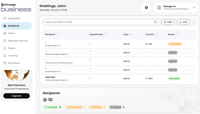 Once you’re in, you’ll land on Dashboard, where you can access the main flows: Recipients, Payroll, Allocations, and Payers.